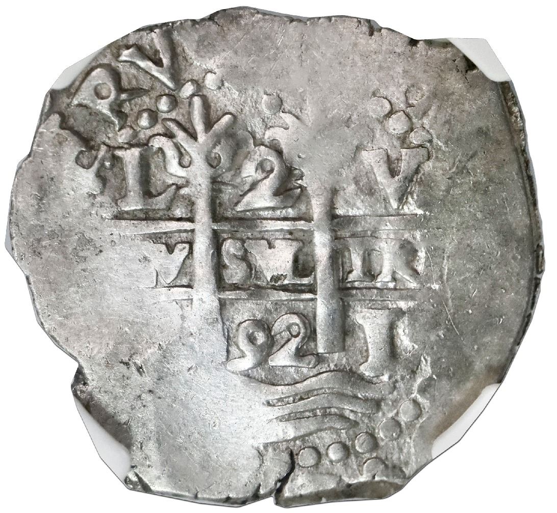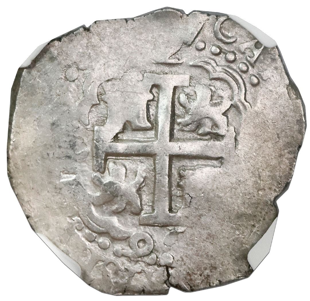Lima, Peru, cob 2 reales, 1692V, NGC VF 35. S-L10; KM-21; Cal-349. 6.64 grams. Very broad flan with choice full pillars and cross (both well centered) but flat peripheries, two dates, two+ mintmarks, no toning, fully XF in our opinion. NGC #4216471-013. Pedigreed to the Arturo Rosenheim collection.