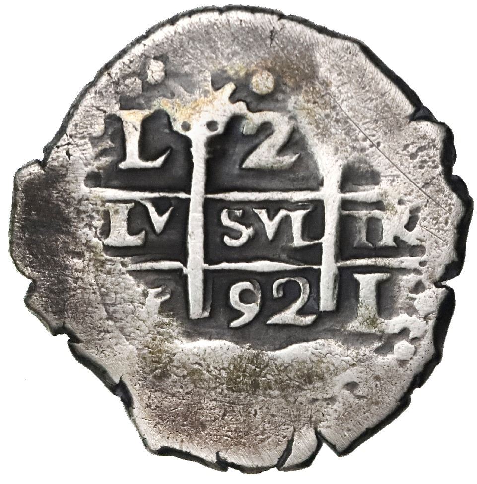 Lima, Peru, cob 2 reales, 1692V. S-L10; KM-21; Cal-349. 6.32 grams. Very bold full pillars with bold full date and both mintmarks, the cross doubled and off-center, mostly flat peripheries, VF with contrasting toning. Pedigreed to the Arturo Rosenheim collection.