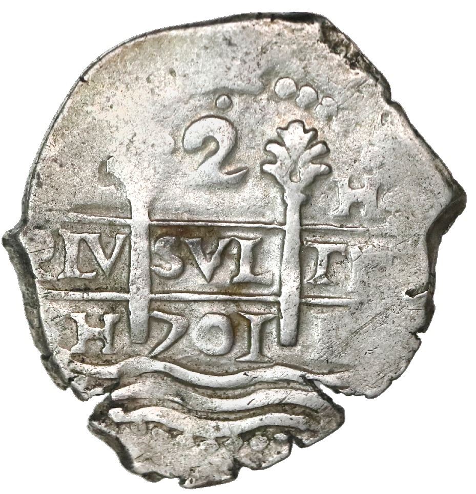 Lima, Peru, cob 2 reales, 1701H. S-L15; KM-21; Cal-359. 5.38 grams. Full pillars-and-waves, full but doubled cross, two dates, three assayers and mintmarks, mostly non-toned XF with tiny edge-splits. Pedigreed to the Arturo Rosenheim collection.