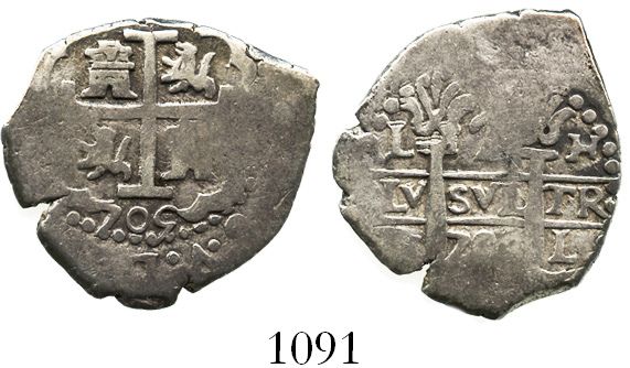 Lima, Peru, cob 2 reales, 1705H. S-L15a; KM-32; CT-1194. 6.5 grams. Full pillars with bold assayer and 2 bold mintmarks, full but off-center cross with bold date below, attractively toned Fine+ with minor weak spots.