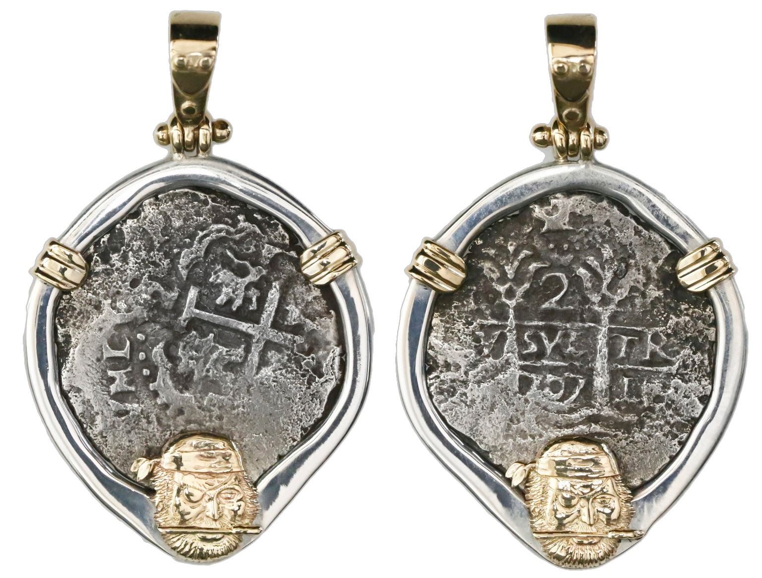 Lima, Peru, cob 2 reales, 1707R, ex-Princess Louisa (1743), mounted pillars-side out in heavy sterling silver bezel with 14K gold prongs, shackle bail and pirate face embellishments at bottom. 12.38 grams total. Choice full pillars, off-center cross, light to moderate surface corrosion, nicely toned. From the Princess Louisa (1743).