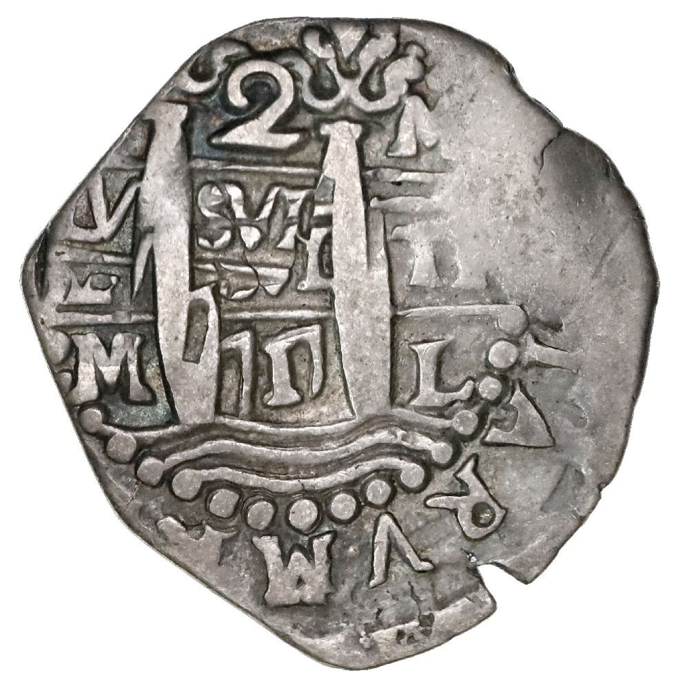 Lima, Peru, cob 2 reales, 1717M. S-L20; KM-32; Cal-730. 5.30 grams. Choice full cross, full but off-center pillars-and-waves (slightly doubled), two dates and mintmarks, three assayers, richly old-toned VF, tiny notch in edge and possibly lightly clipped long ago. Pedigreed to the Arturo Rosenheim collection.