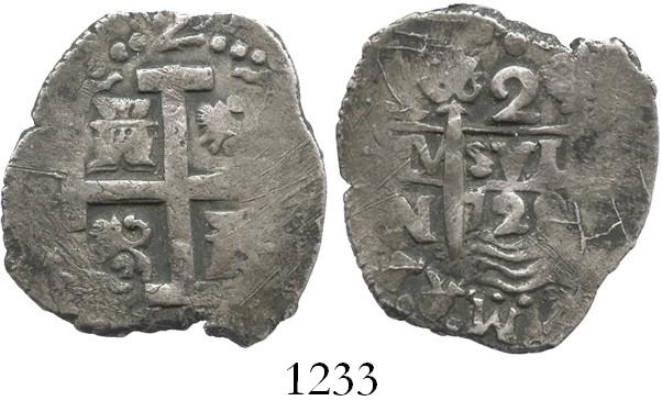 Lima, Peru, cob 2 reales, 1728N. S-L21; KM-32; CT-1217. 6.8 grams. Big flan with bold cross and one full pillar, toned VF. Pedigreed to the Roberto Mastalir collection of Lima silver cobs.
