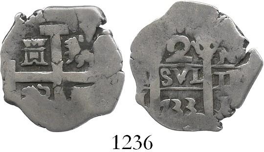 Lima, Peru, cob 2 reales, 1733N. S-L21; KM-32a; CT-1222. 5.1 grams. Very bold and nearly full cross and pillars, VF with dark, contrasting toning on fields, small edge-split. Pedigreed to the Roberto Mastalir collection of Lima silver cobs.