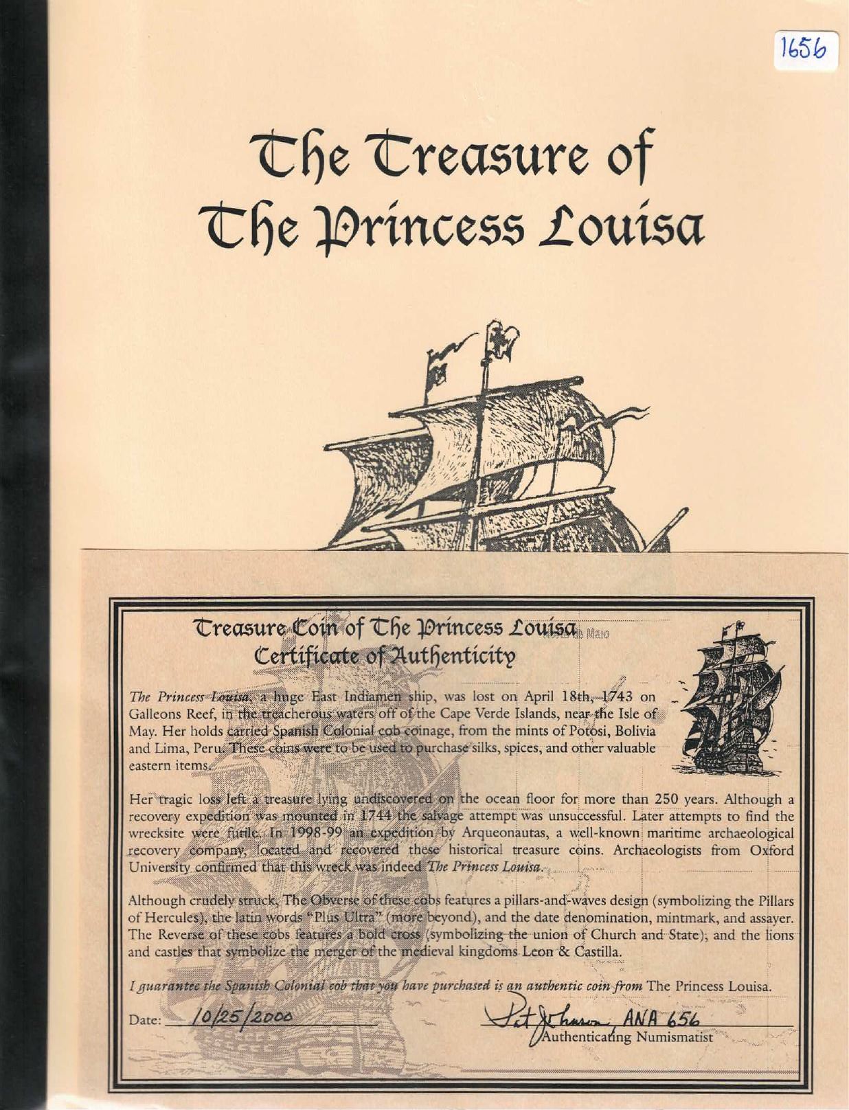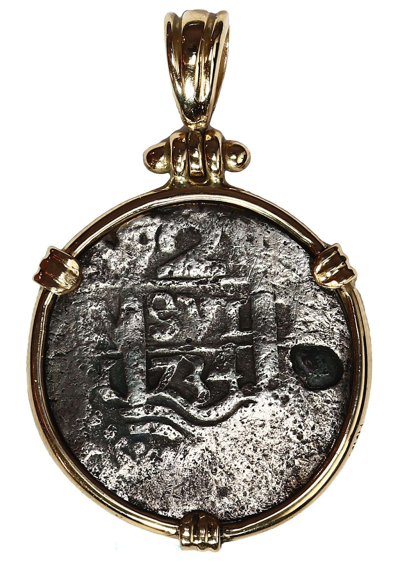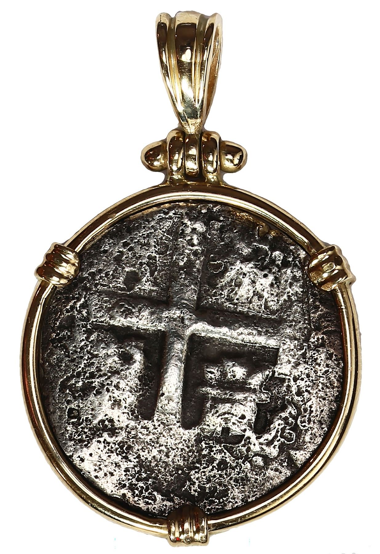 Lima, Peru, cob 2 reales, 1734 N, ex-Princess Louisa (1743), mounted cross-side out in 14K gold bezel with shackle bail. 9.17 grams total. Full pillars and clear date plus most of the cross quite bold despite moderate corrosion, ideal orientation so either side can be worn facing out. From the Princess Louisa (1743), with certificate and booklet.