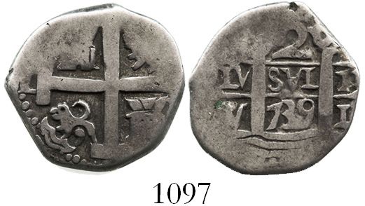 Lima, Peru, cob 2 reales, 1739V. S-L22; KM-32a; CT-1228. 5.3 grams. Nearly full pillars with clear date and assayer, good but incomplete cross with one nice lion, possibly clipped long ago to account for weight, toned Fine+.