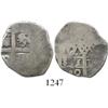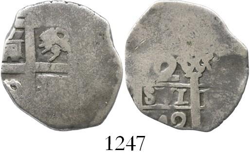 Lima, Peru, cob 2 reales, 1742V. S-L22; KM-32a; CT-1231. 5.9 grams. About half flat due to poor centering and crude strike, lightly toned About Fine. Pedigreed to the Roberto Mastalir collection of Lima silver cobs.