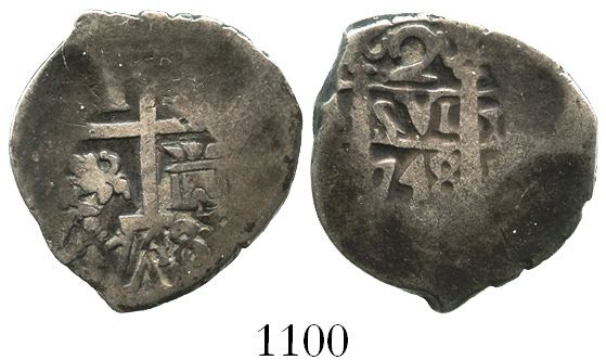 Lima, Peru, cob 2 reales, 1748V. S-L22; KM-32a; CT-1234. 6.6 grams. Two dates (rare thus) and part of king's name, much peripheral flatness but clear centers, richly old-toned Fine.