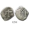 Lima, Peru, cob 2 reales, 1748V. S-L22a; KM-A43; CT-468. 5.7 grams. Bold detail with contrasting toning, 2 dates, but worn (About Fine). Pedigreed to the Roberto Mastalir collection of Lima silver cobs.