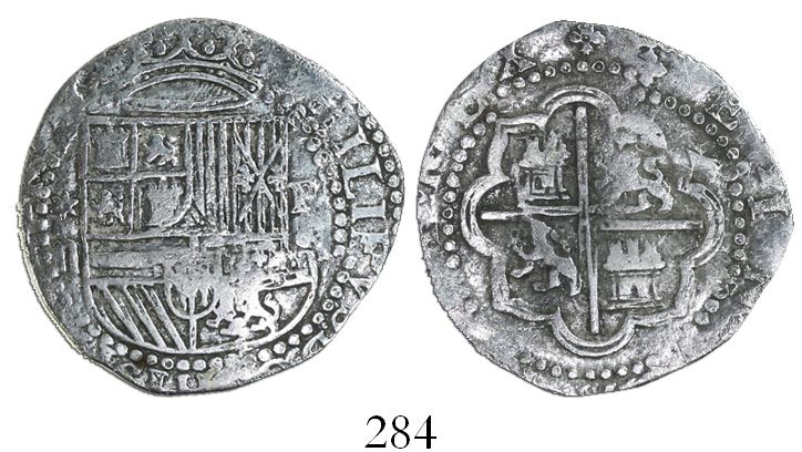 Lima, Peru, cob 2 reales, Philip II, assayer Diego de la Torre, *-ii to left, P-oD to right, Grade 2. S-L4; KM-9; CT-487. 6.65 grams. Choice full shield and cross and crown with minor doubling, toned in crevices, no corrosion (hence Grade 1 all day long). With Fisher certificate #109076. Recovered from: Atocha, sunk in 1622 west of Key West, Florida