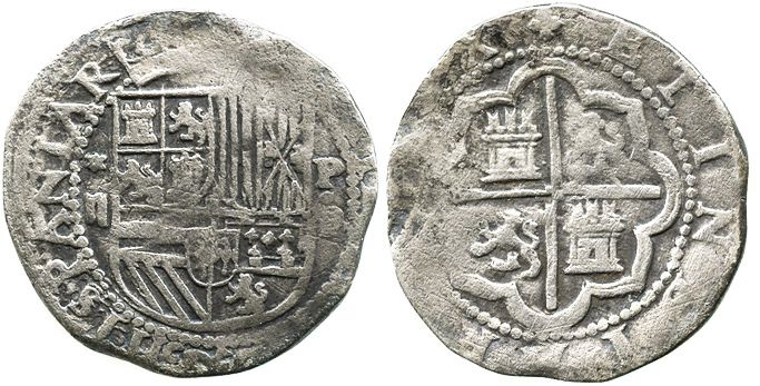 Lima, Peru, cob 2 reales, Philip II, assayer Diego de la Torre, *-ii to left, P-oD to right. S-L4; KM-9; CT-487. 6.4 grams. Choice full shield with full HISPANIARVM in legend, good full cross-and-tressure, nice VF with toned fields and very light surface corrosion.