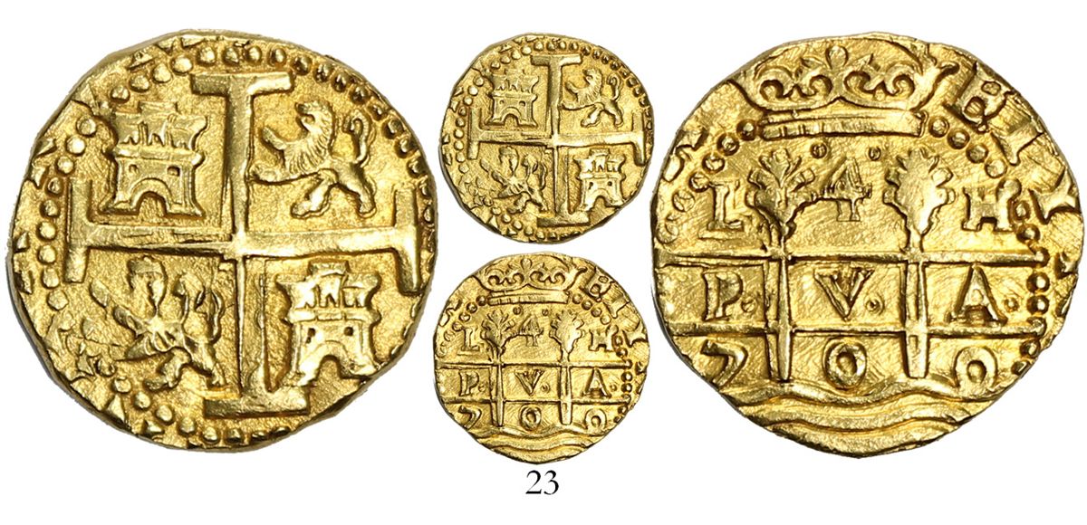 Lima, Peru, cob 4 escudos, 1700H, from the 1715 Fleet. S-L25; KM-25 ;CT-95. 13.44 grams. Choice full shield and crown, full but slightly doubled cross-lions-castles, high grade (AU) but with light marks on rims from mounting, still a rather example of a rare type (Charles II). From the 1715 Fleet.