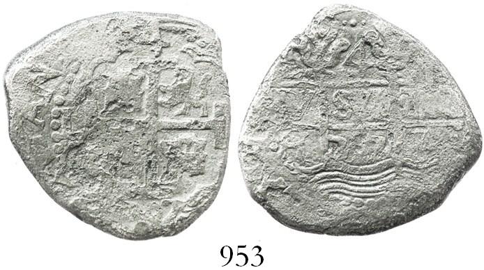 Lima, Peru, cob 4 reales, 1707H, scarce. S-L17; KM-33. 11.6 grams. Full pillars-and-waves and cross despite moderate corrosion, low contrast (somewhat weak details), 2 partial dates.  From: Princess Louisa, sunk in 1743 off the Cape Verde Islands, west of Africa