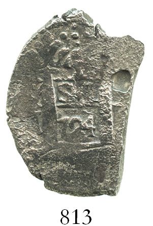Lima, Peru, cob 4 reales, 1724(M). S-L20; KM-33; CT-979. 9.3 grams. Full pillars with clear date, nearly full but pitted cross, part of edge lost to corrosion. Recovered from: Princess Louisa, sunk in 1743 off the Cape Verde Islands, west of Africa