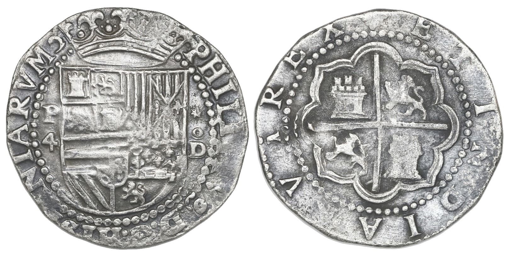 Lima, Peru, cob 4 reales, Philip II, assayer Diego de la Torre, P-4 to left, *-oD to right.