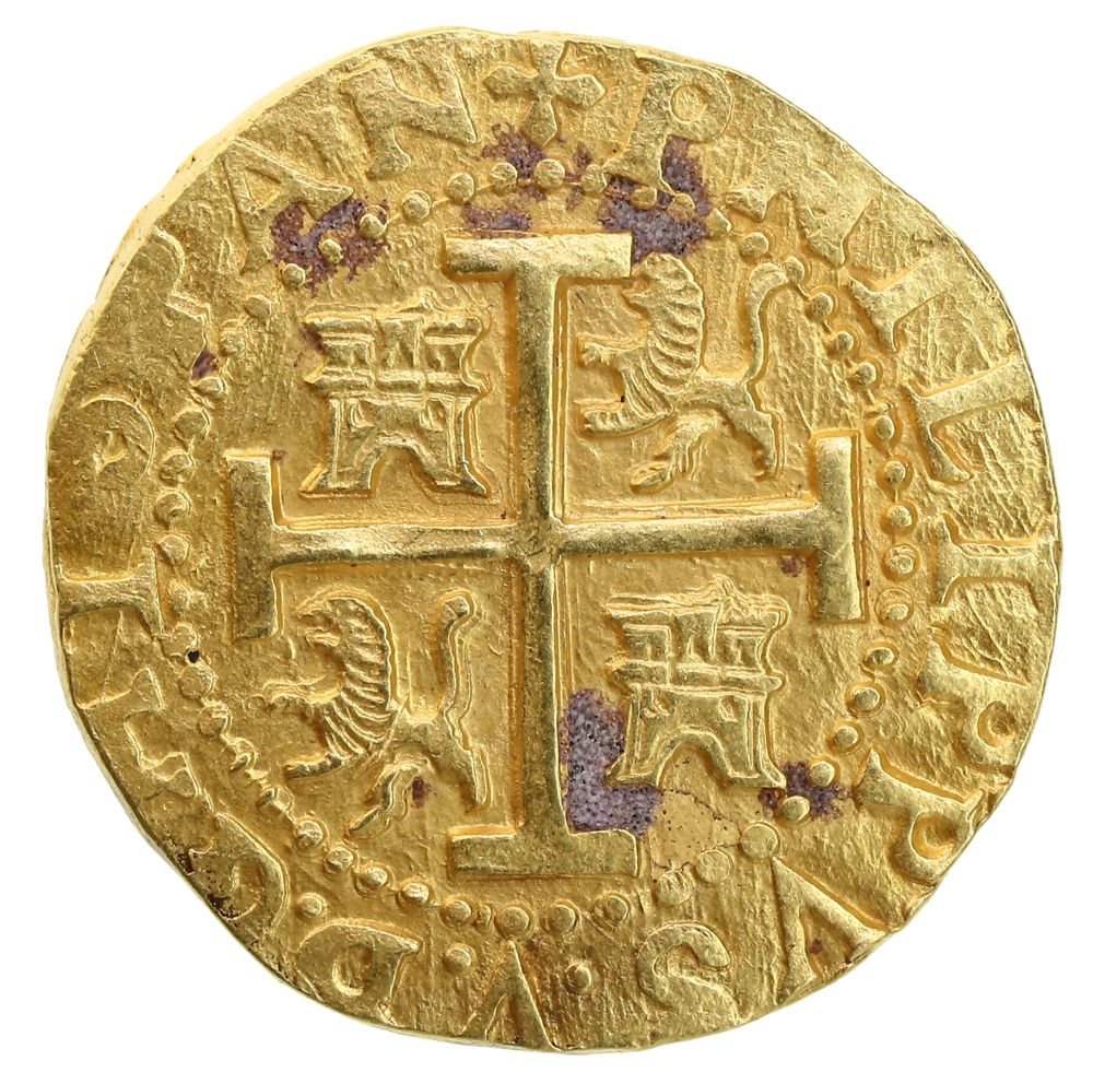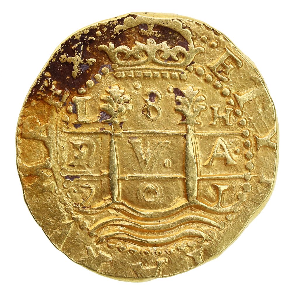 Lima, Peru, cob 8 escudos, 1701H, Philip V, extremely rare, from the 1715 Fleet. S-L25a; KM-38.1. 26.95 grams. Almost round, evenly struck and perfectly centered, this would be an exceptional specimen for any date, let alone one that is missing in Calico and the State of Florida collection (theirs is Charles II). In fact we can trace only one other example for Philip V, an AU 55 of demonstrably inferior strike but with perhaps slightly more evidence of the coins' having been created from a modified 1700 die. The present coin is at least AU 58 but bears areas of red staining and gray coral that preclude professional encapsulation. What is more important is that the strike is nearly perfect--well centered and even--and the effect in hand is sheer beauty. From the 1715 Fleet.