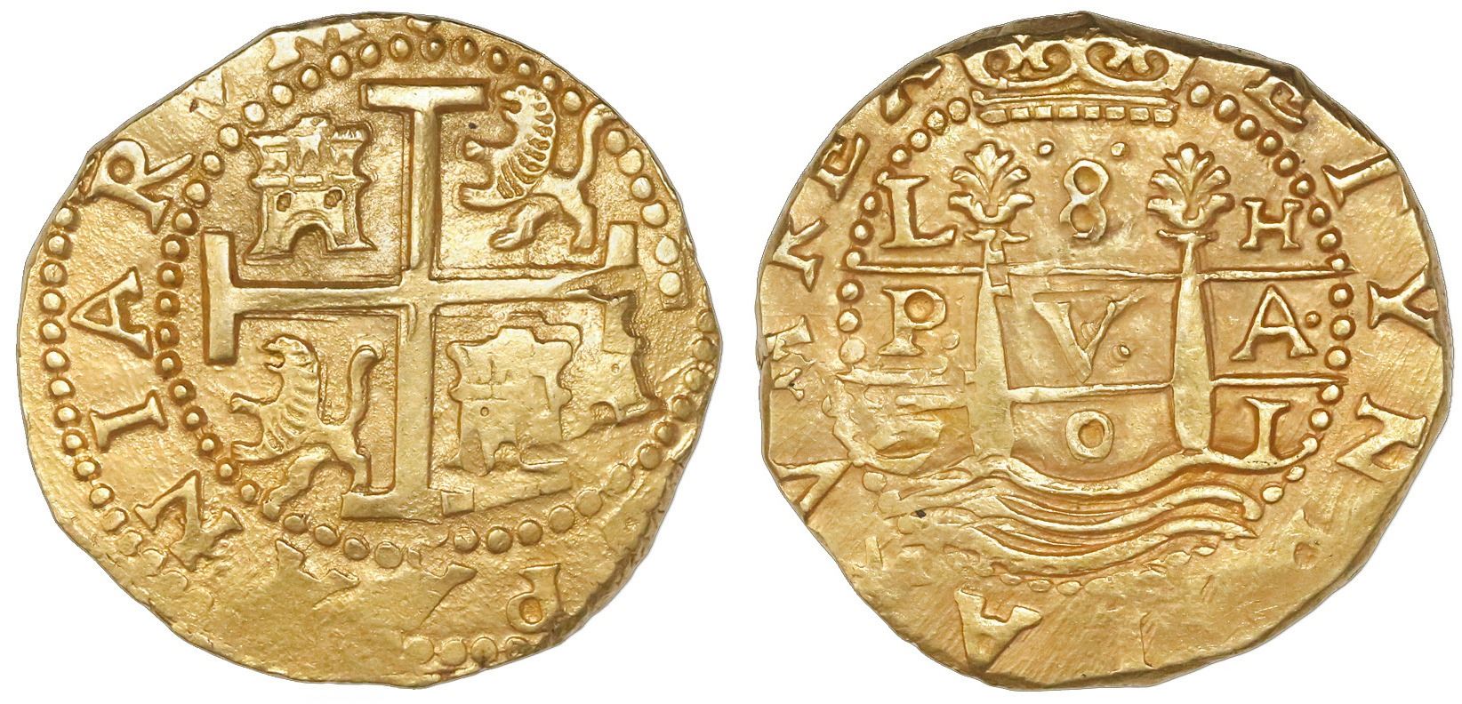 Lima, Peru, cob 8 escudos, 1701H, posthumous Charles II, extremely rare, PCGS MS63, ex-Pullin, ex-1715 Fleet (both designated on label). S-L25; KM-26.2. 26.94 grams. Thick and smallish flan with full and well-centered pillars-and-waves with nearly full crown above, full cross-lions-castles (off-center), muted luster under light toning, king's name off the flan but inferred from positioning, one of only two specimens known of this date for Charles II, and the only one without overdate 1/0 (and of course the finest and only known specimen in either PCGS or NGC censuses). From the 1715 Fleet, with photo-certificate, pedigreed to the John Pullin collection. PCGS #36269986.