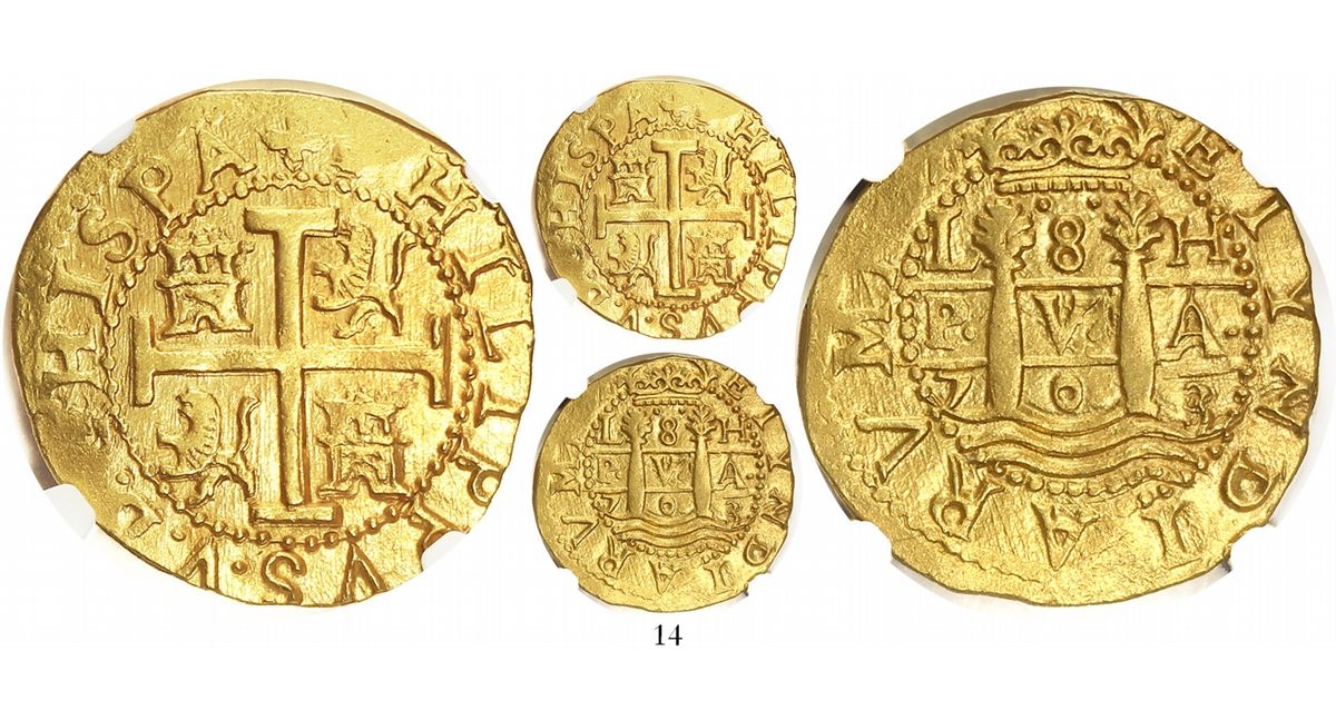 Lima, Peru, cob 8 escudos, 1703/2H, from the 1715 Fleet, very rare (unique overdate), encapsulated NGC MS 62. S-L25a; KM-38.1 ;CT-13. 26.9 grams. This is an exciting coin: For starters it is lustrous Mint State and well struck, well centered (also aligned axes) and with virtually full legends, which enables the advanced researcher to study the dies carefully. The cross side is an exact match with Tauler #219, but the pillars-side die is previously unknown, either for 1702 or 1703 (of which only 2-3 of each are known, none in the State of Florida collection), with a straight-bottom crown that ended in 1703. The overdate is hard to see (NGC missed it, after all), due to minor doubling (localized to that spot only), but an overlay comparison with the "2" on the 1702 in our Auction #6 (lot 21) proves it. A unique coin like this has unlimited potential, but for comparison we would like to point out that the only other 1703 we have sold (Auction #3 lot 8, which was the highlight of the 2003 Tampa sale, where it sold for $13,250) realized $17,250 in 2008. Also note the previously cited 1702 sold for $25,300 in 2009! From the 1715 Fleet, with photo-certificate.