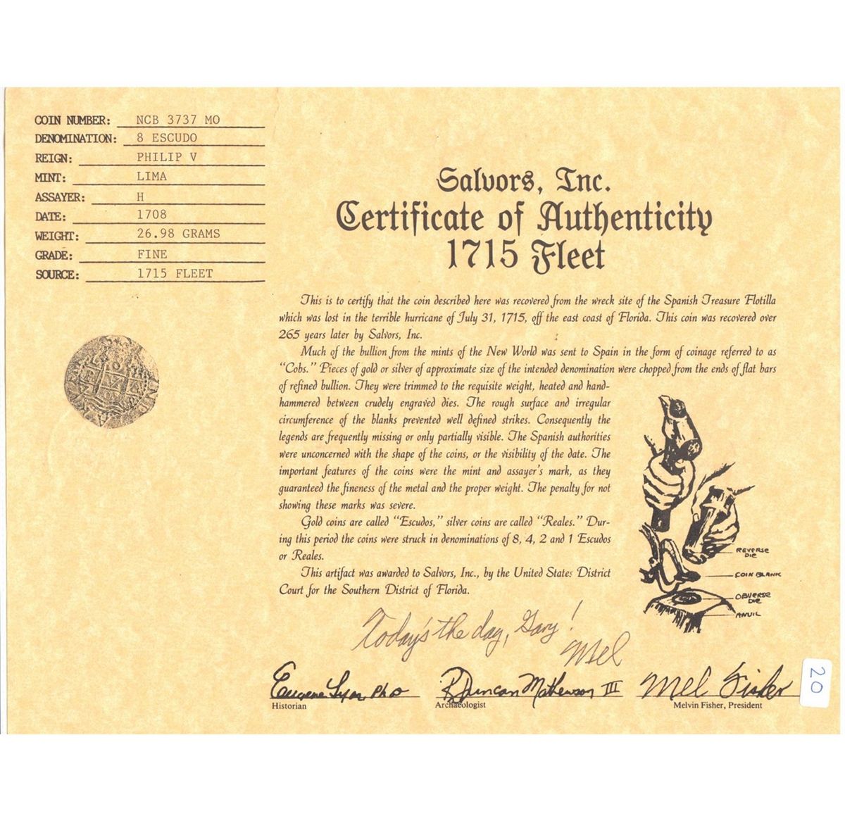 Lima, Peru, cob 8 escudos, 1708H, from the 1715 Fleet.