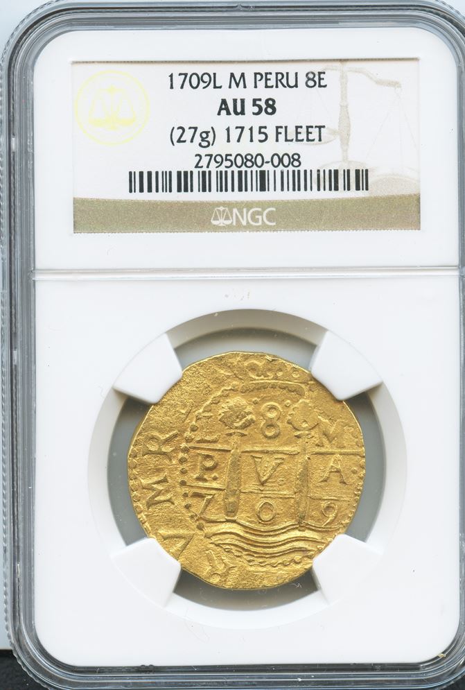 Lima, Peru, cob 8 escudos, 1709M, from the 1715 Fleet, encapsulated NGC AU 58.