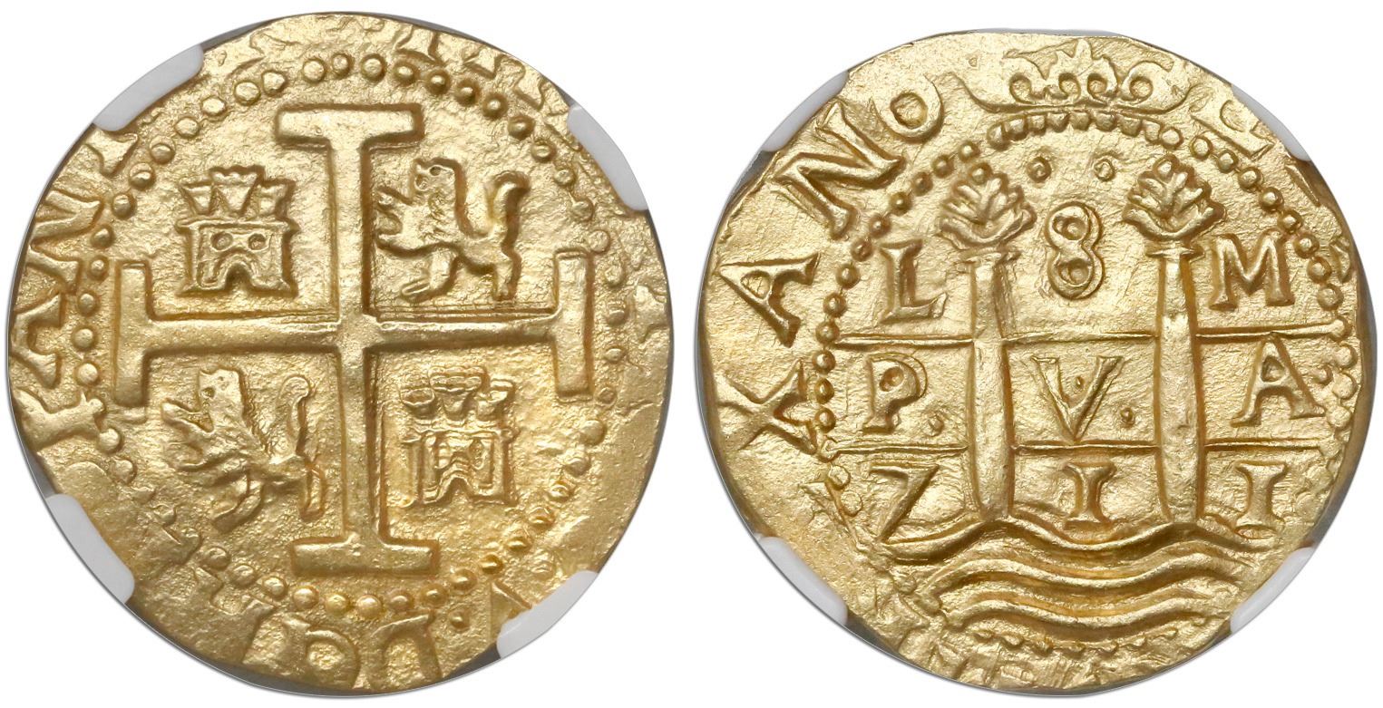 Lima, Peru, cob 8 escudos, 1711M, encapsulated NGC MS 63, from the 1715 Fleet (stated inside slab).