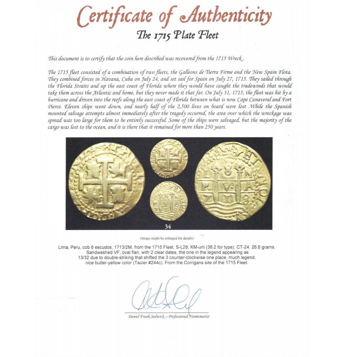 Lima, Peru, cob 8 escudos, 1713/2M, from the 1715 Fleet.