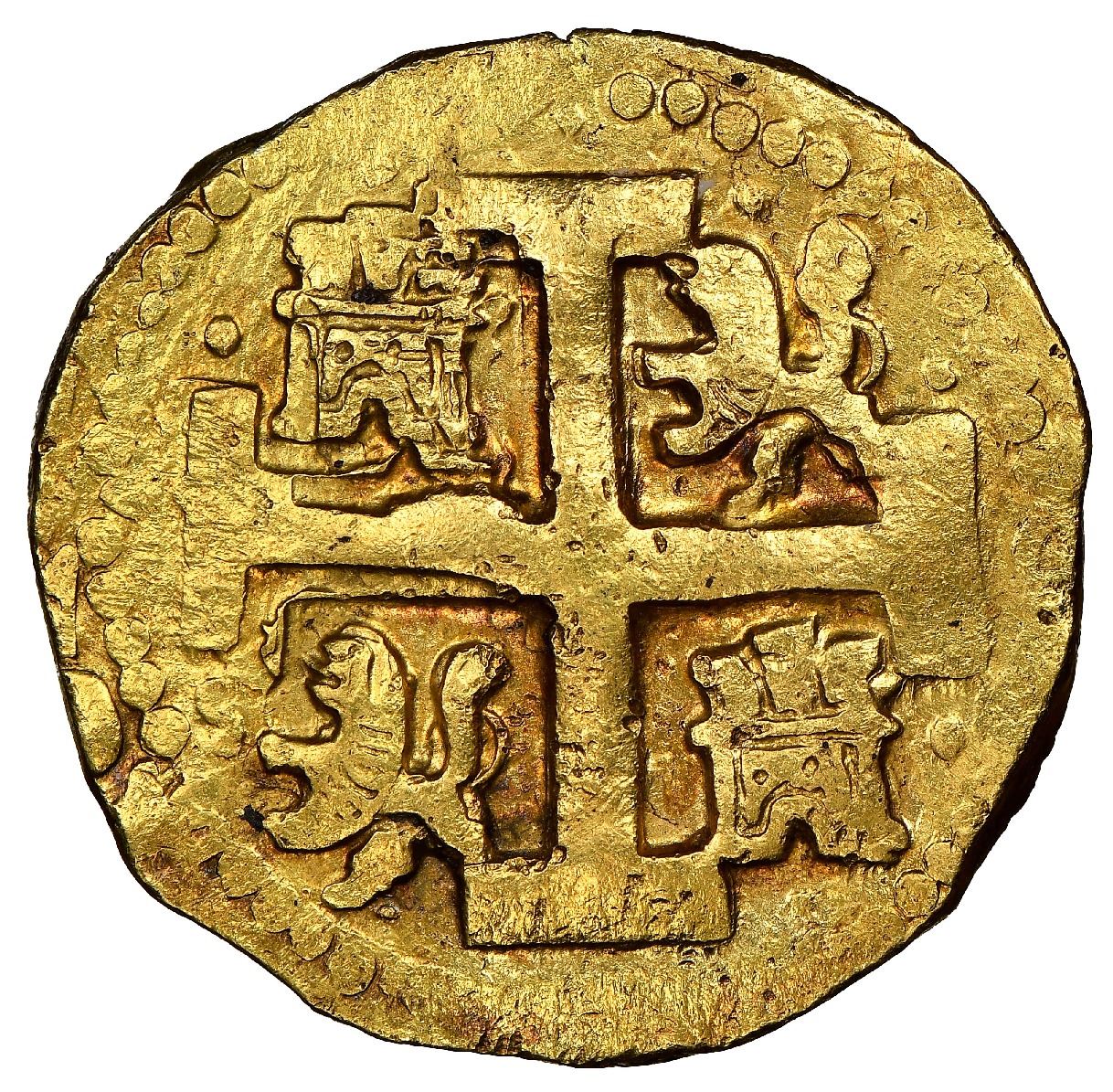 Lima, Peru, cob 8 escudos, 1719M, rare. S-L28; KM-38.2; Cal-2130. 26.90 grams. Perfectly round, thick flan (as made) with bold and well-centered full cross-lions-castles and pillars-and-waves, AU with spots of nice, old, orange toning, dot variety per Tauler #265.