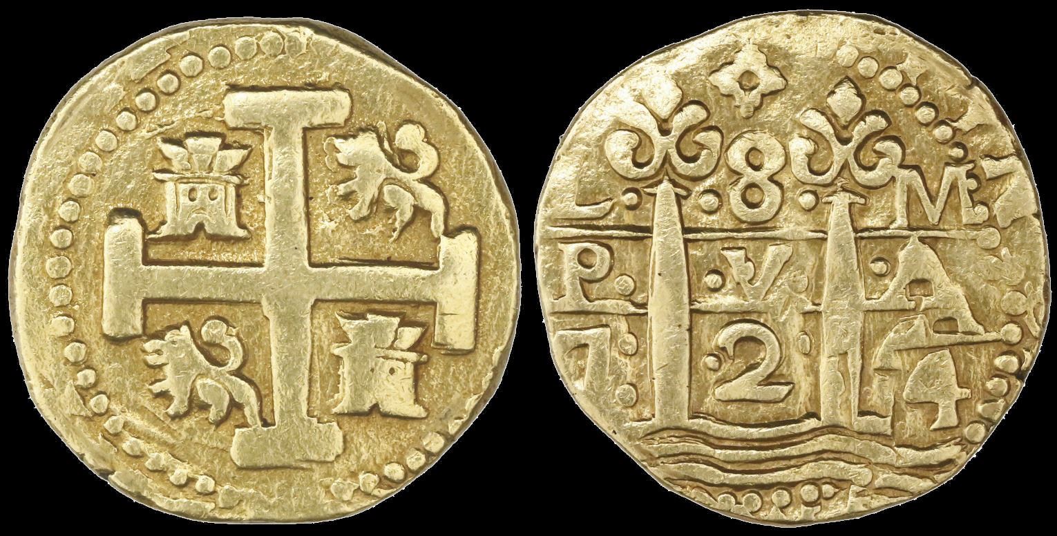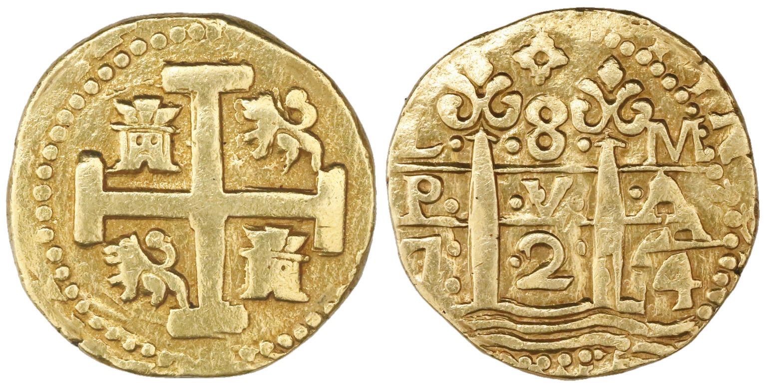 Lima, Peru, cob 8 escudos, 1724M. S-L28; KM-38.2; CT-38. 26.80 grams. Good full cross, bold but slightly doubled and slightly off-center pillars, AU with hint of toning all over.