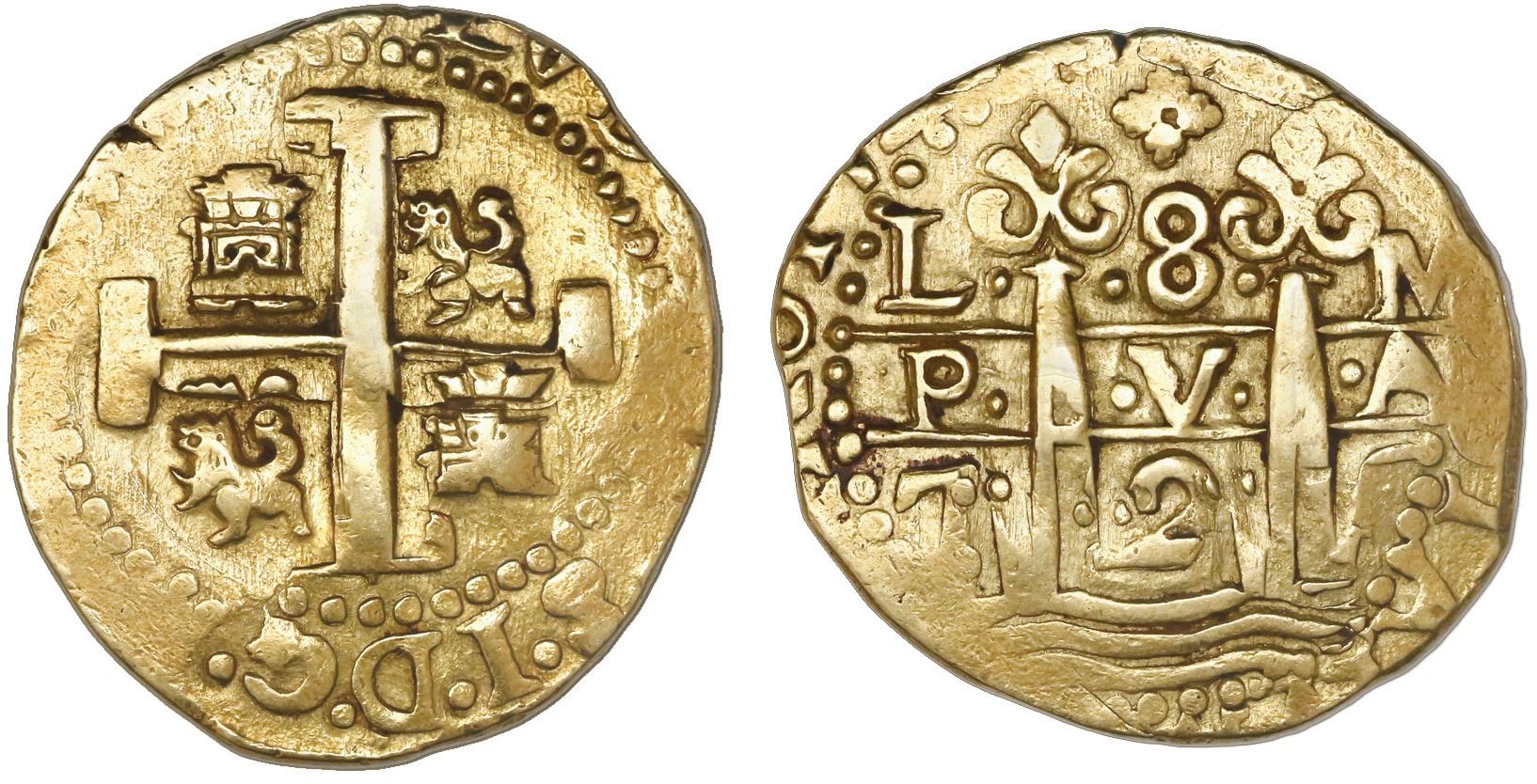 Lima, Peru, cob 8 escudos, 1725M, Louis I, rare. S-L28a; KM-40; CT-1. 26.99 grams. Oblong flan with full cross and pillars (double-struck), date a bit weak but with the all-important LVDO(VICV)S I clearly visible, XF+ with toning around details, slightly red around edge. Pedigreed to our Auction #22, with original lot-tag #32.