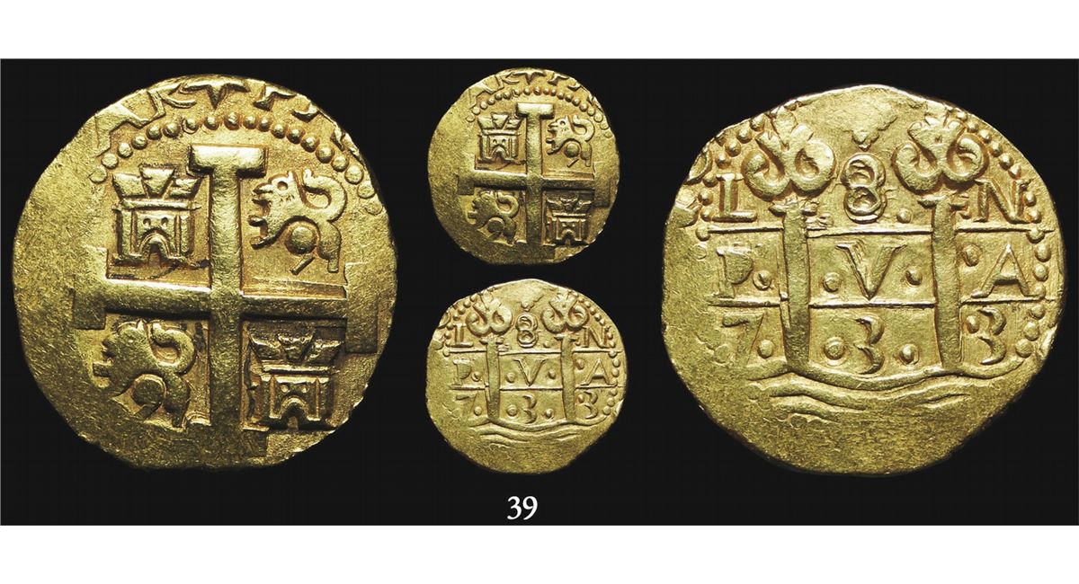 Lima, Peru, cob 8 escudos, 1733N, supposedly from the 1733 Fleet (rare provenance). S-L29; KM-38.2; CT-48. 27.0 grams. Bold AU- with choice and perfectly centered pillars-and-waves and cross-lions-castles, with fine black sediment in crevices (lending credence to its supposed provenance). Here it should be noted that Tauler lists 4 different varieties based on "distinct punctuation," i.e., the dots in and among the pillars-side elements, and the present specimen appears to be a variety that is unlisted, with a "high" dot to the left of the final 3 of the date. Supposedly from the 1733 Fleet, with (unsigned dealer's) certificate #95G-010 from 1995.