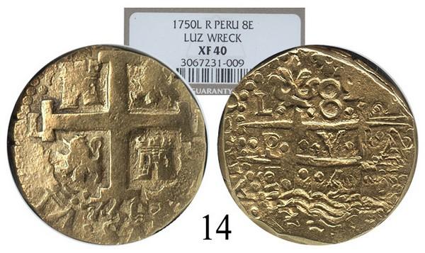 Lima, Peru, cob 8 escudos, 1750R, encapsulated NGC XF-40. S-L31. Bold mintmark and denomination on otherwise doubled pillars side, full but off-center cross with second date below (unique to this issue), full king's ordinal VI in legend, small and thick flan, AXF, desirable shipwreck provenance. From the Luz (1752).