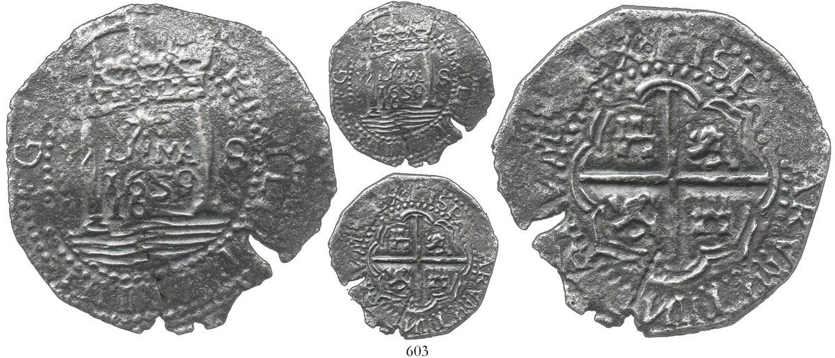 Lima, Peru, cob 8 reales, 1659V, "Star of Lima" type, Royal-like, rare. S-L5; KM-18.1. 21.9 grams. Like the 1652 transition at Potosi, the 1659 "Star of Lima" mintage yielded some coins that were clearly much better than the business strikes but not quite up to the "Royal" standard seen in other periods, and the present coin is just such a specimen, with full inner details and most of the legends on a broad, roundish flan, its Royal status belied by small edge-cracks and slight doubling (also lightly corroded, but nicely toned), yet curiously it was struck from the same dies as lot #260 of our Treasure Auction #5, touted as the finest known specimen and sold for over $21,000! From the "Jupiter wreck" (San Miguel el Arcangel), sunk in 1659 off the east coast of Florida, with photo-certificate from salvager.