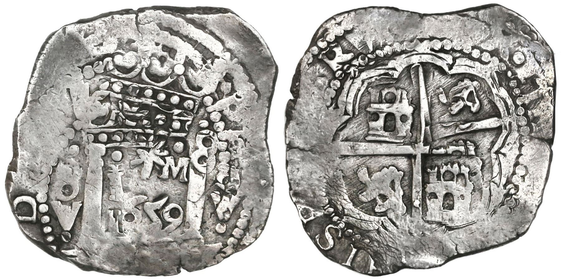 Lima, Peru, cob 8 reales, 1659V, "Star of Lima" type (Series II), rare. S-L5; KM-18.1. 26.82 grams. Crudely uneven flan as usual (also typically doubled), with full pillars and crown and cross, clear date and mintmark and assayer, VF with lightly toned fields, very solid example for this popular, unauthorized type, this series being much scarcer than shipwreck-sourced Series I coins.