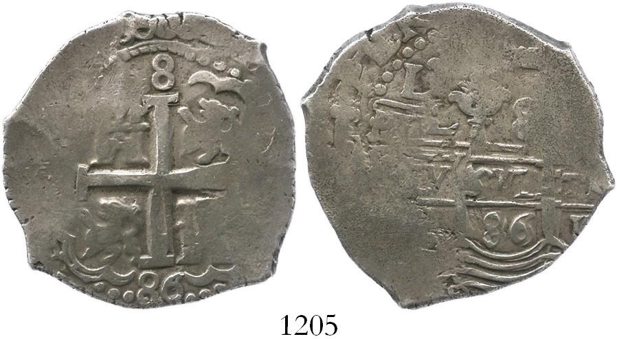 Lima, Peru, cob 8 reales, 1686R. S-L7; KM-24; CT-229. 27.1 grams. Big flan with good full cross (flat on sides), full but off-center and doubled pillars, 2 dates, nicely toned VF.