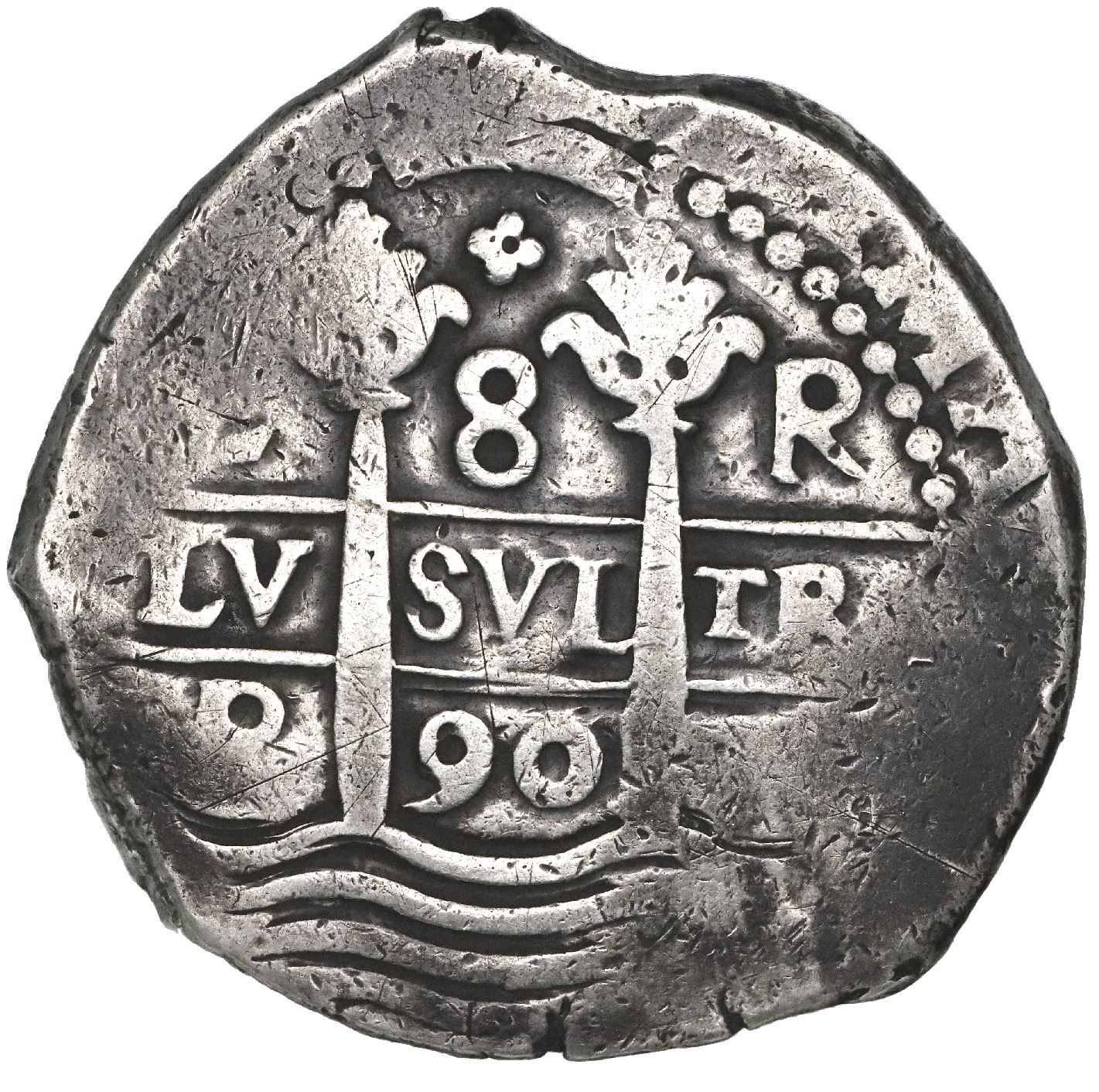 Lima, Peru, cob 8 reales, 1690R. S-L9; KM-24; Cal-595. 27.31 grams. Choice full cross and pillars-and-waves, the latter with bold four-petal flower ornament at top (as opposed to a dot like on other specimens), two bold dates, two assayers, AVF with deep, contrasting toning, a few light old scratches, scarce. Pedigreed to the Arturo Rosenheim collection.