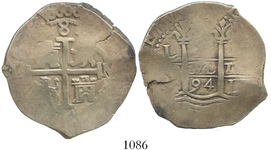 Lima, Peru, cob 8 reales, 1694M. S-L11; KM-24; CT-238. 27.4 grams. Choice full pillars with bold date in between and 2 clear mintmarks, nearly full cross with third mintmark to left and assayer to right, technically no worse than AXF but with much flatness (as made), nicely lightly toned, small edge-split, well-centered strike.