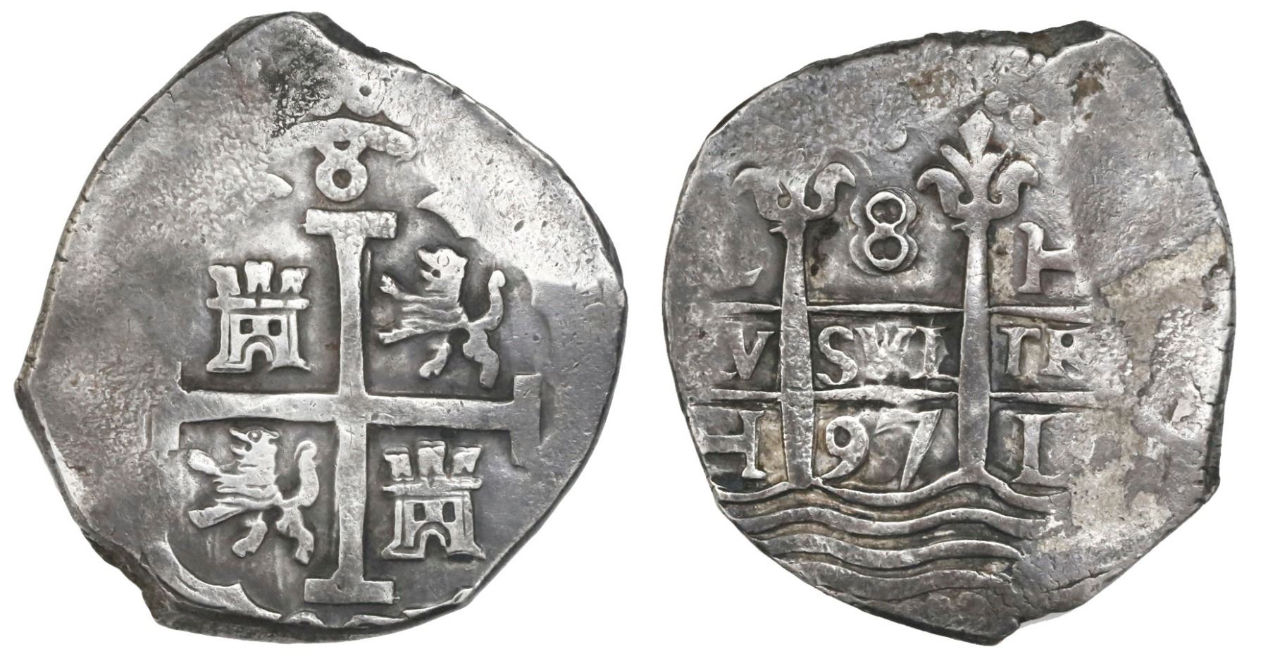 Lima, Peru, cob 8 reales, 1697H. S-L13; KM-24; CT-241. 27.26 grams. Choice full cross-lions-castles, full pillars-and-waves, no doubling but peripherally flat, toned AXF.