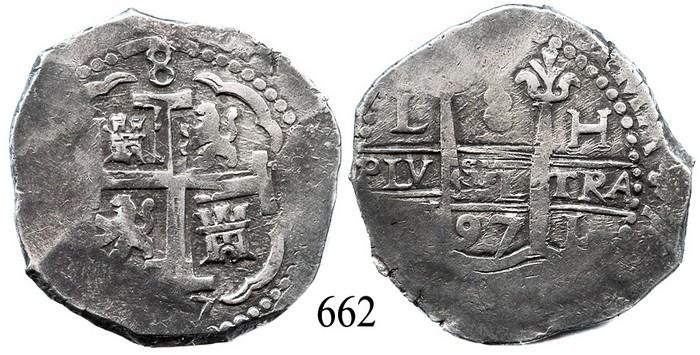 Lima, Peru, cob 8 reales, 1697H. S-L13. 27.2 grams. Lustrous and high grade (XF+) with full cross and pillars, 2 dates and mintmarks and denominations, bold assayer, very slightly doubled with minor flat spots.