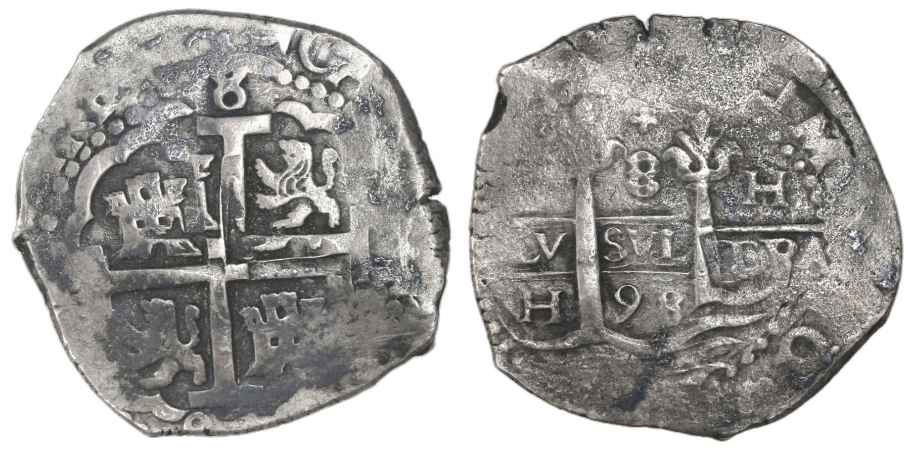 Lima, Peru, cob 8 reales, 1698H. S-L13; KM-24; CT-243. 26.97 grams. Bold but doubled full cross-lions-castles, full pillars-and-waves, deeply toned with spots of black "horn silver" and faint surface porosity as from unspecified salvage.