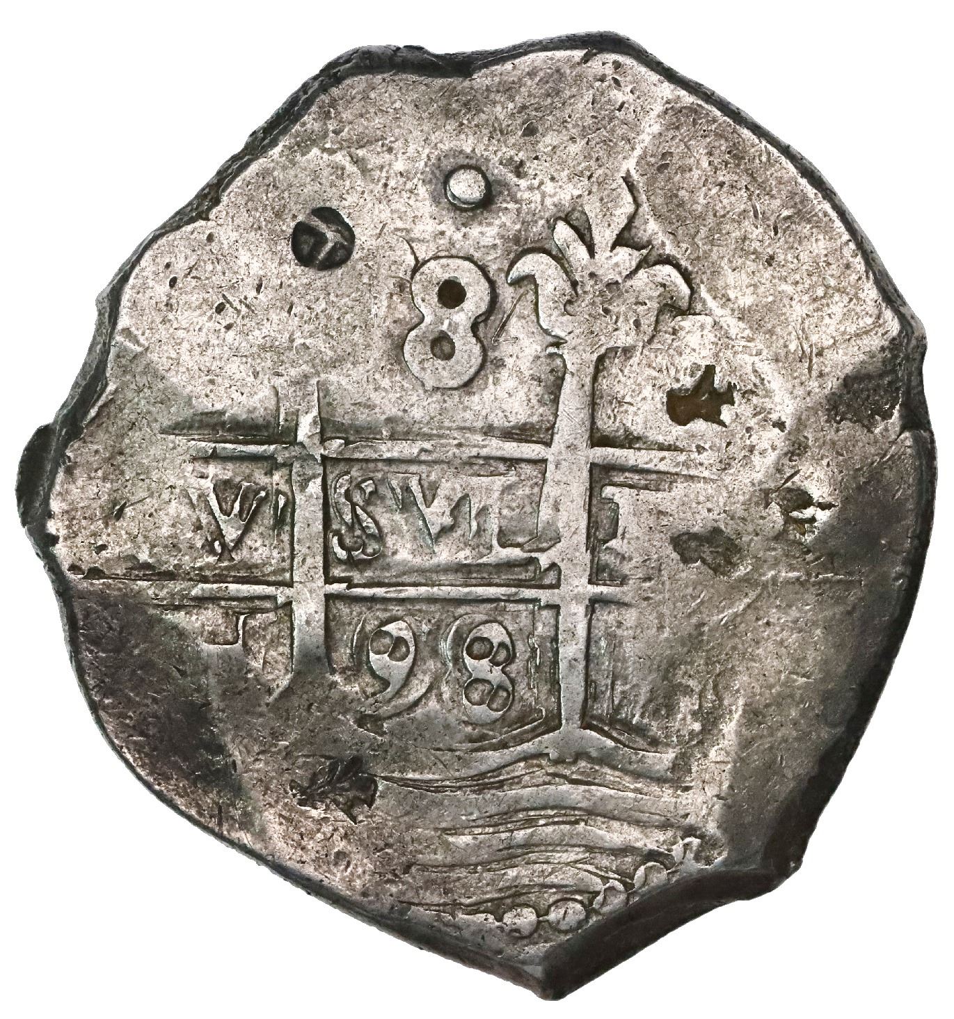 Lima, Peru, cob 8 reales, 1698H. S-L13; KM-24; Cal-605. 27.08 grams. Good full cross and nearly full pillars-and-waves (very slightly doubled) with dot ornament at top (as opposed to a flower ornament on other specimens, e.g., Calbeto #273), VF+ with faint luster and traces of dark encrustation in crevices, and sprinkled with small but well-defined chopmarks on both sides as from circulation in Asia. Pedigreed to the Arturo Rosenheim collection.