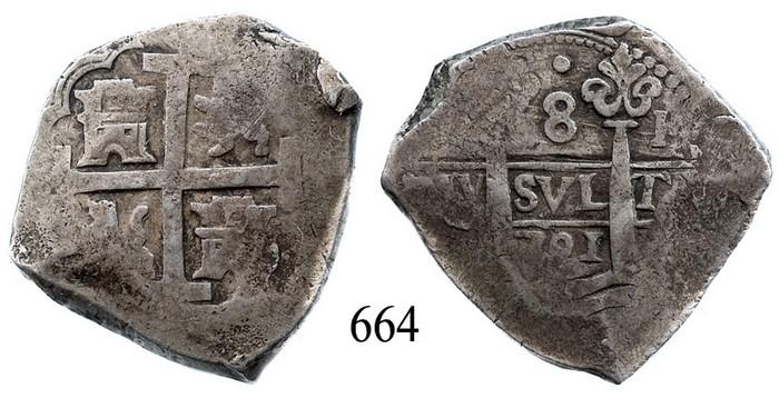 Lima, Peru, cob 8 reales, 1701H, probably Charles II, Calbetó Plate Coin. S-L15. 26.4 grams. Thick, chunky flan with full cross, one choice pillar, bold denomination, clear date, no part of king's name or ordinal visible but almost certainly Charles II despite Calbetó's attribution to Philip V. Plate Coin #277 in Calbetó's Compendium (1970).