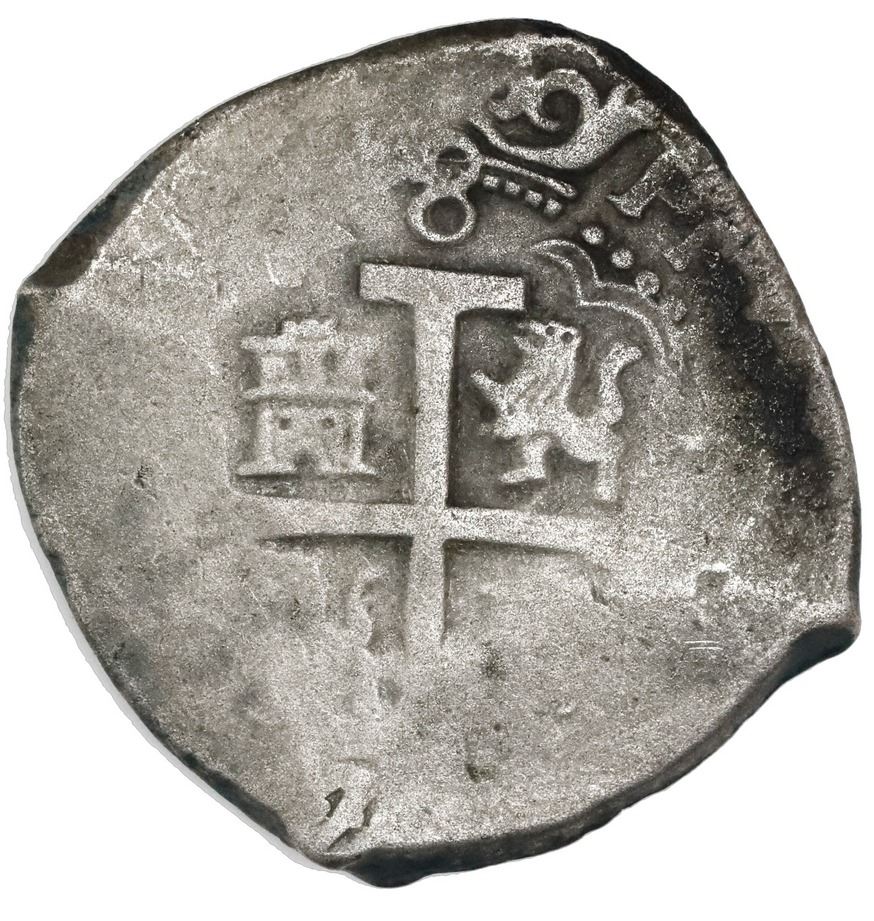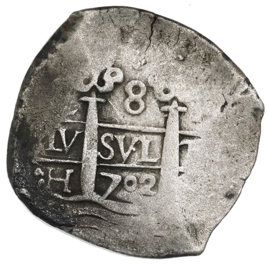 Lima, Peru, cob 8 reales, 1702H. S-L15a; KM-34; Cal-1273. 26.62 grams. Very solid, squarish flan with nearly full pillars and cross, clear date and assayer, peripherally flat but virtually uncorroded, unevenly toned, overall choice and scarce. Recovered from: Spanish 1715 Fleet, east coast of Florida