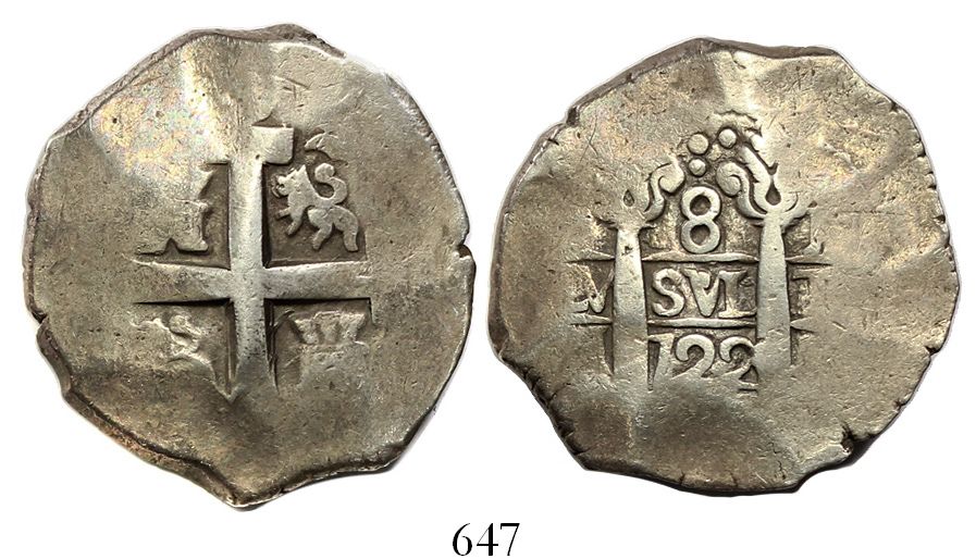 Lima, Peru, cob 8 reales, 1722M. S-L20; KM-34 ;CT-644. 26.80 grams. Bold centers (cross and pillars, the latter with clear date) but with extensive peripheral flatness, nicely toned VF for actual wear.