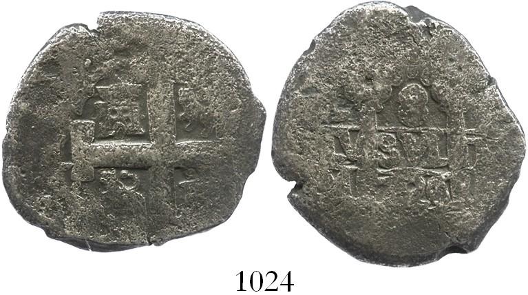 Lima, Peru, cob 8 reales, 1726(M). S-L20b; KM-34a. 21.8 grams. Thick and chunky but corroded and dark, one full castle and tops of pillars, clear date and denomination. From the Princess Louisa, sunk in 1743 off the Cape Verde Islands, west of Africa, pedigreed to the Roberto Mastalir collection of Lima silver cobs, with photo-certificate.