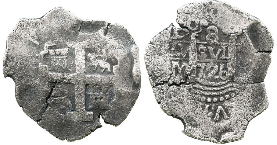 Lima, Peru, cob 8 reales, 1726M. S-L20b. 25.6 grams. Crude, odd-shaped flan with several small edge-splits, nicely toned, with bold pillars-and-waves and cross, bold date and assayer, minimal corrosion. Recovered from: Princess Louisa, sunk in 1743 off the Cape Verde Islands, west of Africa