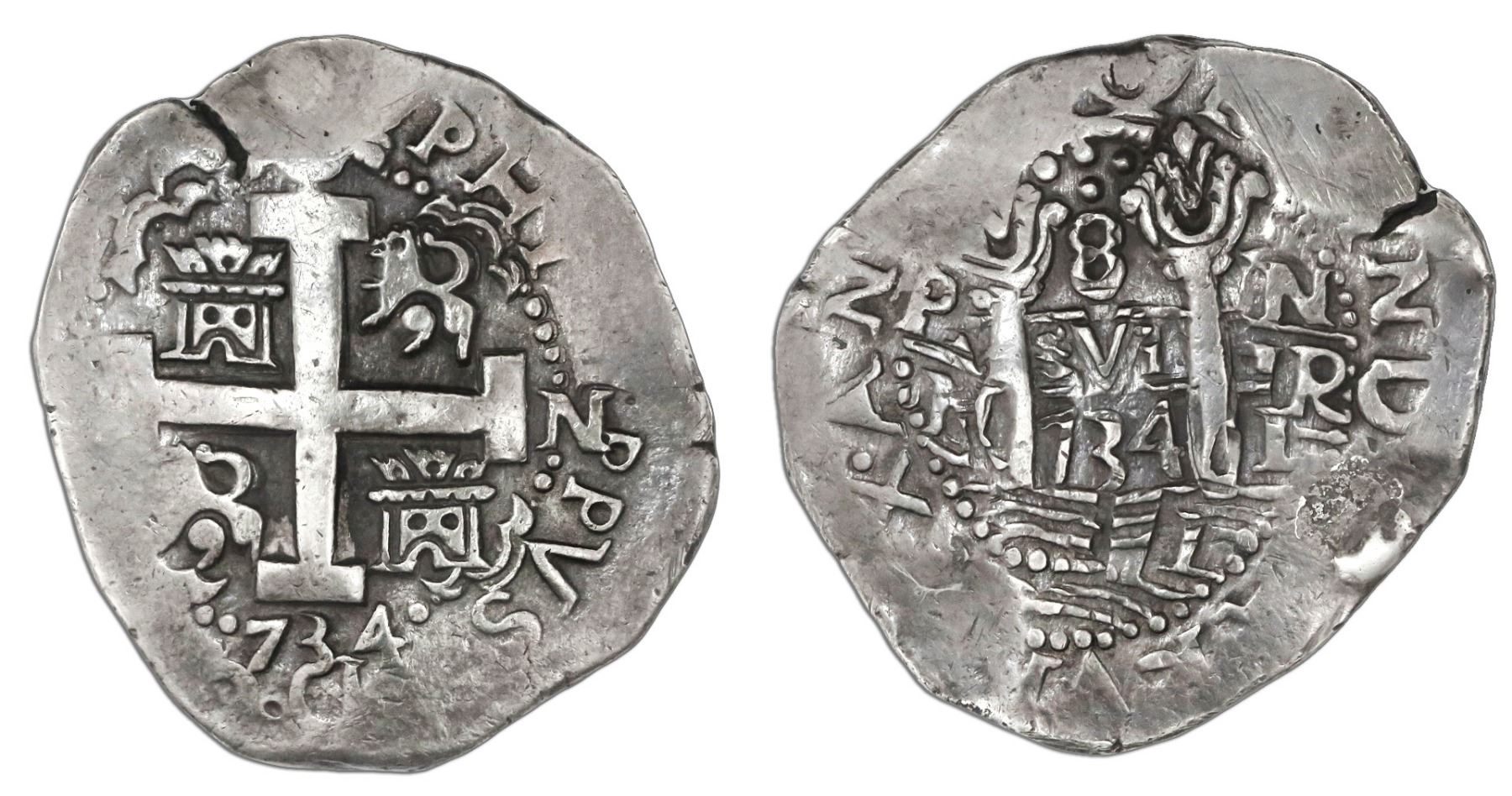 Lima, Peru, cob 8 reales, 1734N. S-L21; KM-34a; CT-655. 26.65 grams. Exceptional full cross with fully detailed lions and castles with date below and assayer to right, most of king's name in legend, the pillars-and-waves also full but double-struck and with solder-mark at 4 o'clock yet with bold second date and two more assayers, deeply toned XF+ with plugged hole at top.