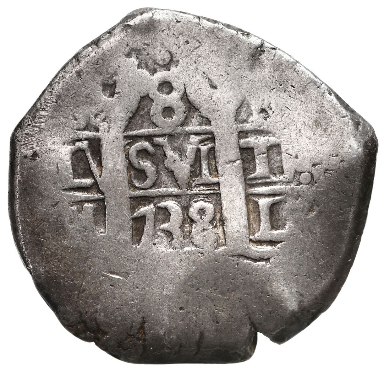 Lima, Peru, cob 8 reales, 1738 N. S-L21; KM-34a; Cal-1313. 26.44 grams. Chunky flan with good centers (and well-centered strike) but extensively flat peripheries, nice rich toning, Fine or so.