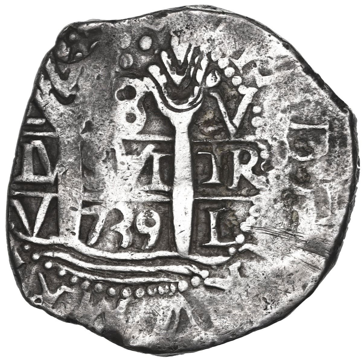 Lima, Peru, cob 8 reales, 1739 V. S-L22; KM-34a; Cal-1315. 27.19 grams. Chunky flan with unusually full (but off-center) pillars-and-waves, bold full cross with full PHILIPPVS in legend, two dates and assayers, toned Fine+ with a few minor scratches.
