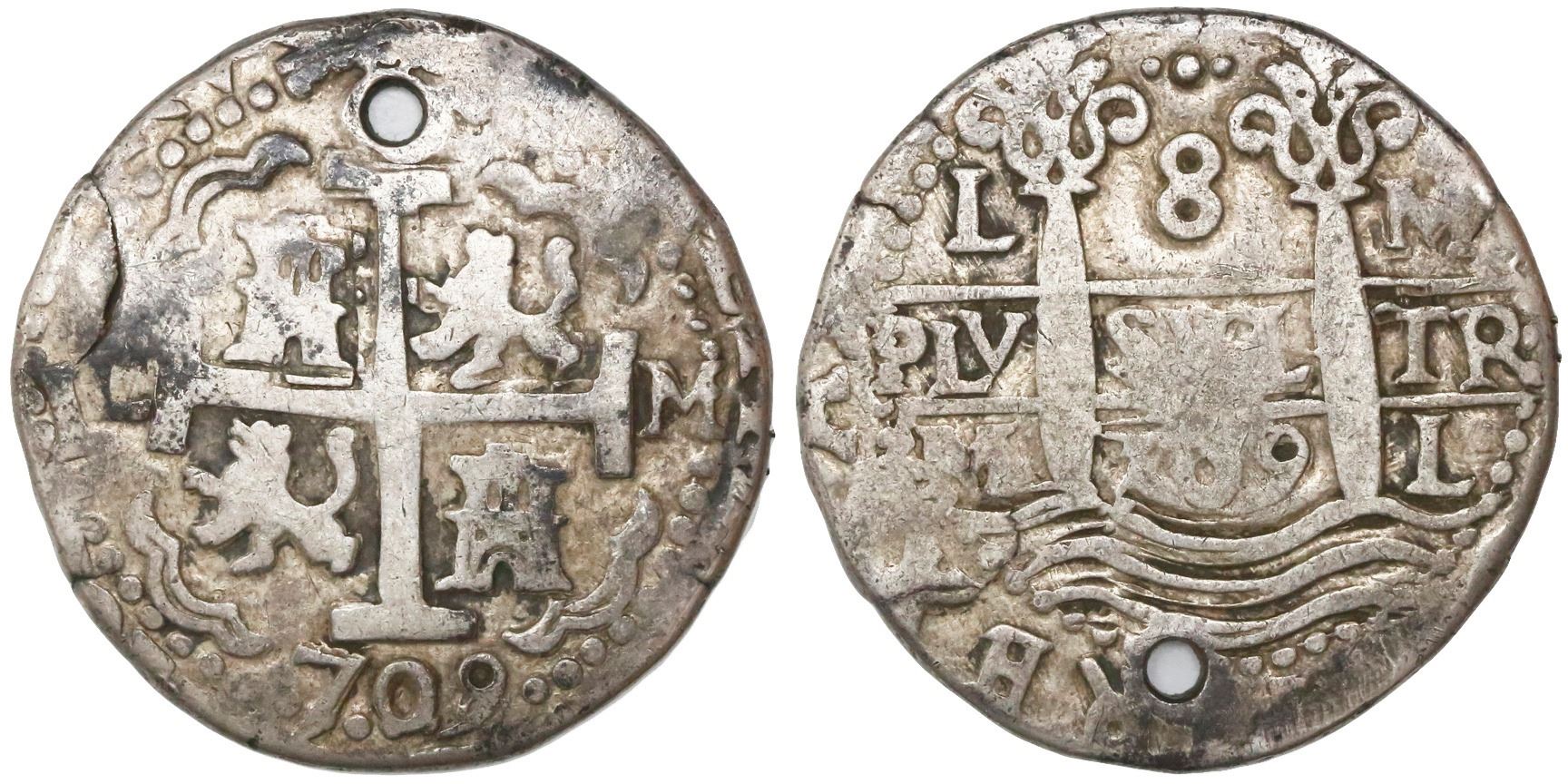 Lima, Peru, cob 8 reales Royal, 1709/8M, very rare. S-L18; KM-unl (type R34). 25.91 grams. Rather crude for a Royal (holed About Fine with traces of gilding) but with full inner details, the overdate (unlisted in KM and CT) clear on the date below the cross, strange crack in edge.