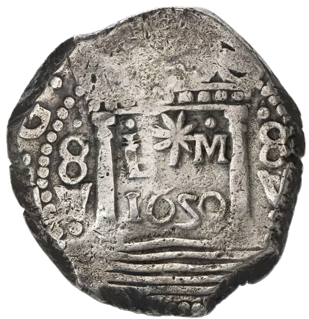 Lima, Peru, cob 8 reales, "Star of Lima," 1659V, L-*-M in center, 8-V to sides. S-L5; KM-18.1; Cal-1247. 27.33 grams. Thick and chunky flan (small diameter) with bold full pillars-and-waves with clear dot-8-V-dot to left and right and L*M (below two dots) above 1659 date in center, nice full cross-lions-castles, much better strike than usual but with legends off the flan, VF with toning in crevices. Pedigreed to the Arturo Rosenheim collection.